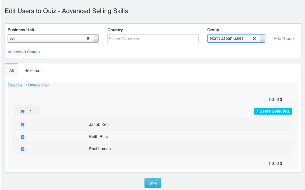 The Add Group link enables you to add a Group in case you don’t have the Group added from before. Once you select the Group, the list of people in the lower section of the page will reflect with the people who have been added to the Group. Next, select the people from the list and click on Save button. The quiz has now been sent to this group.