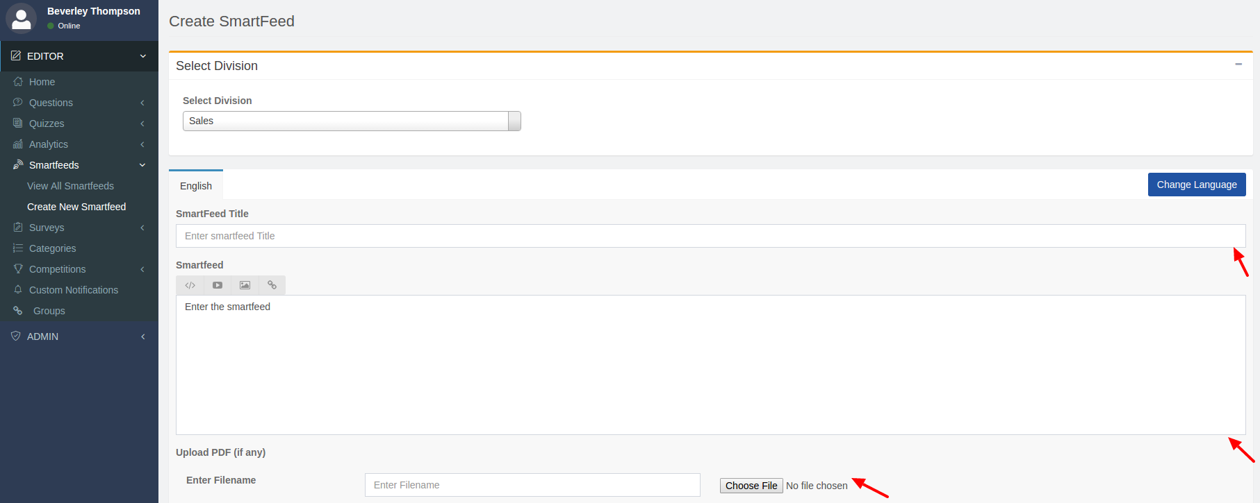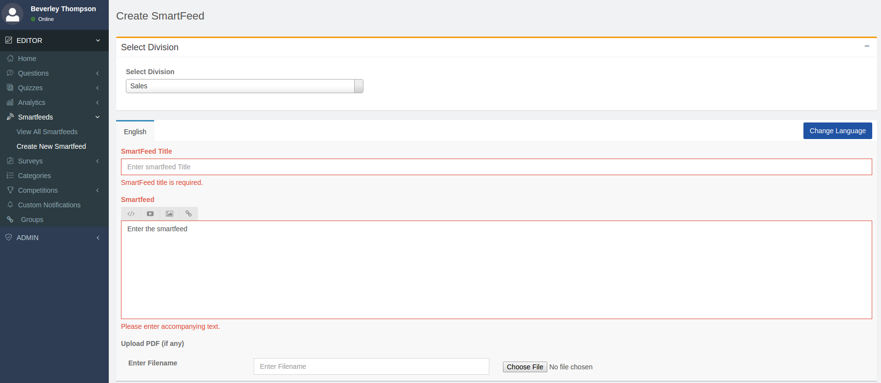 Smartfeed Title and smartfeed are required field. If details are not type in it will show warning