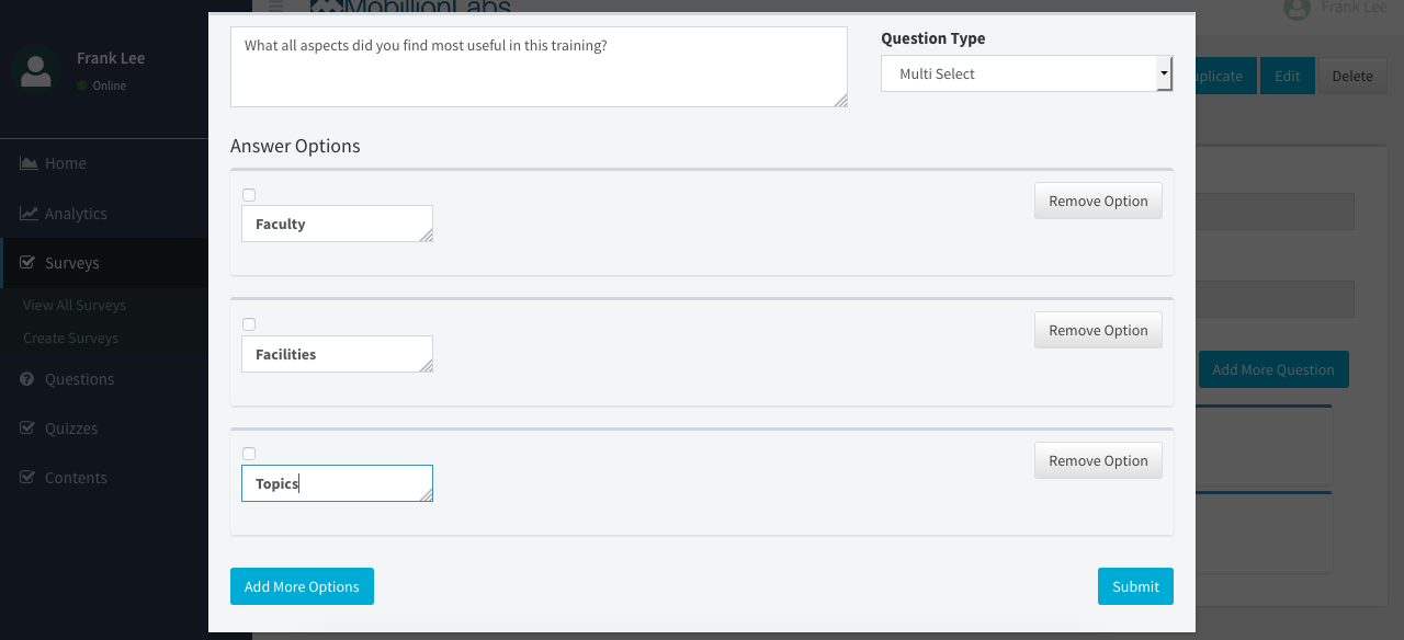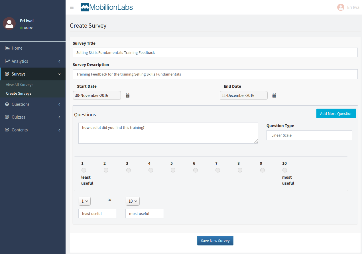 Add the title and description of the survey. The form will also ask you to add the 1st question in the survey. Then click on Save New Survey. It will create a new survey with one question. You can add more questions to the survey by clicking on Add More Question button.