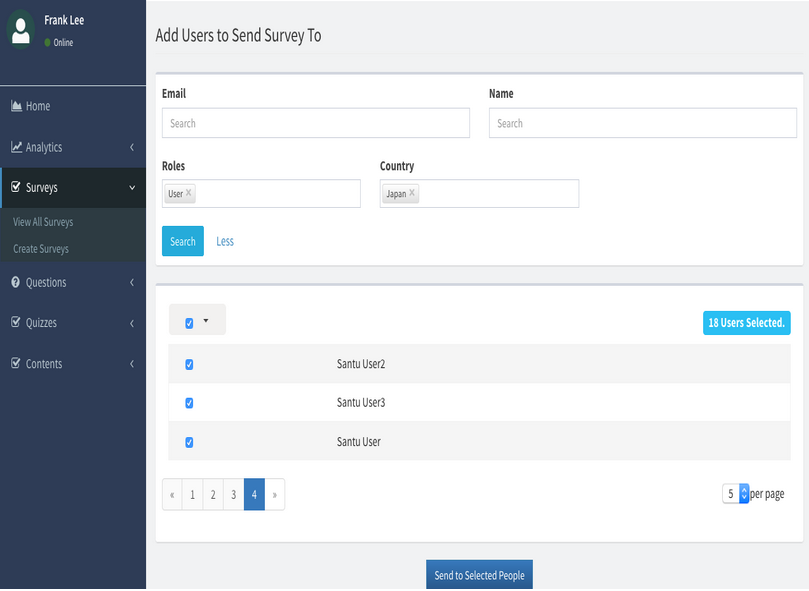 Once a survey is created with questions, send the survey to people who can take it. Click on Assign button at the top right corner. It will open the Assign screen. Use search criteria to select and choose the users. Click on Send to Selected People.
