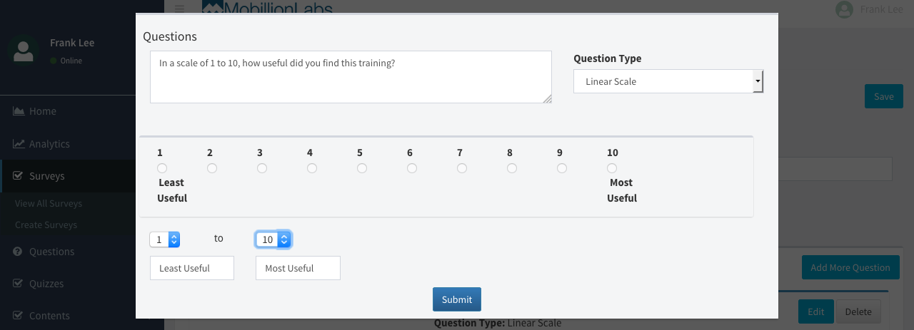 Use this question type when you have to provide a linear scale. You can change the range of linear scale