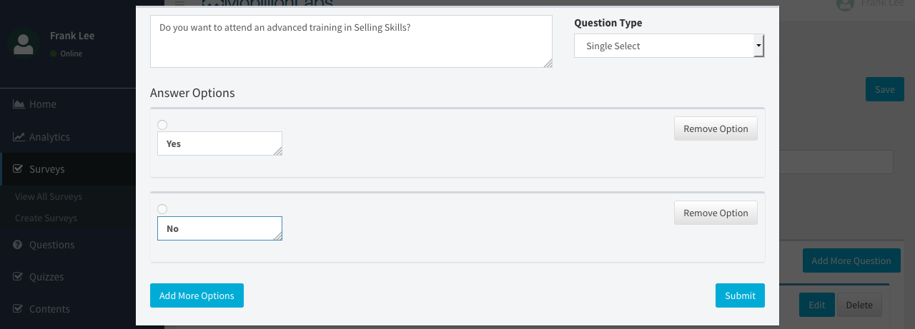 Use the question type Single Select when you need to add a question where the user can select only one answer.