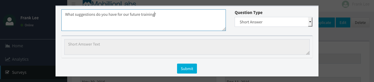 Use the question type Short Answer when you need to add a question where the user can write text.